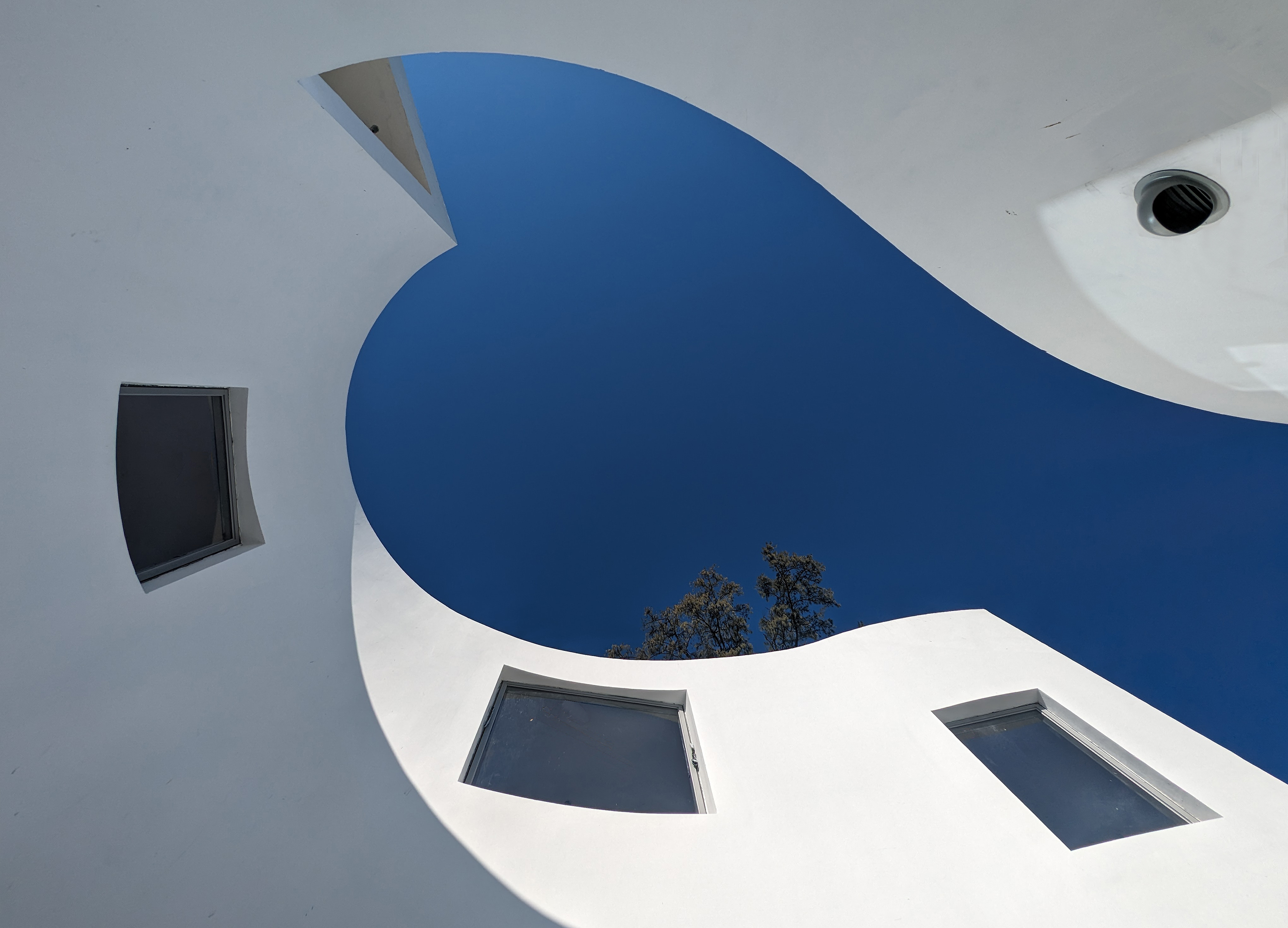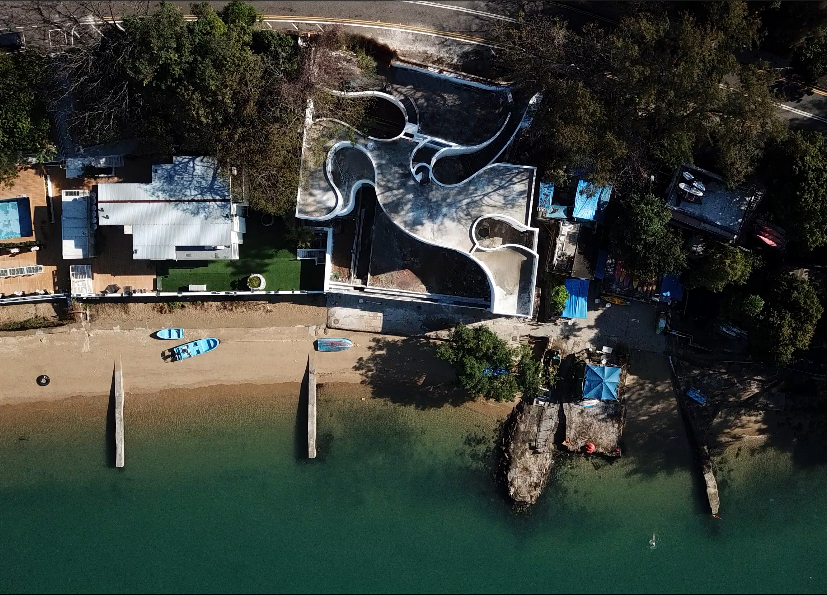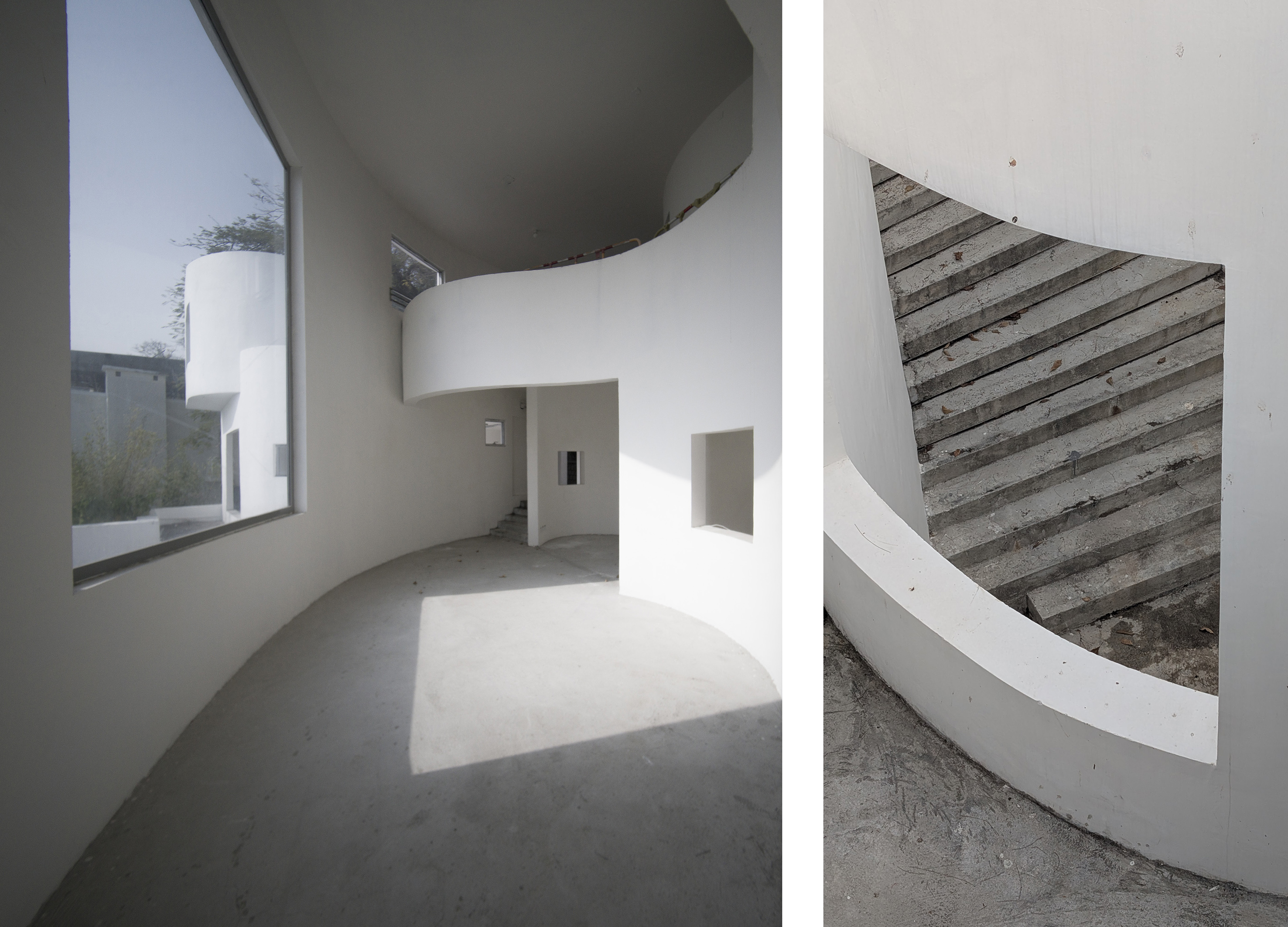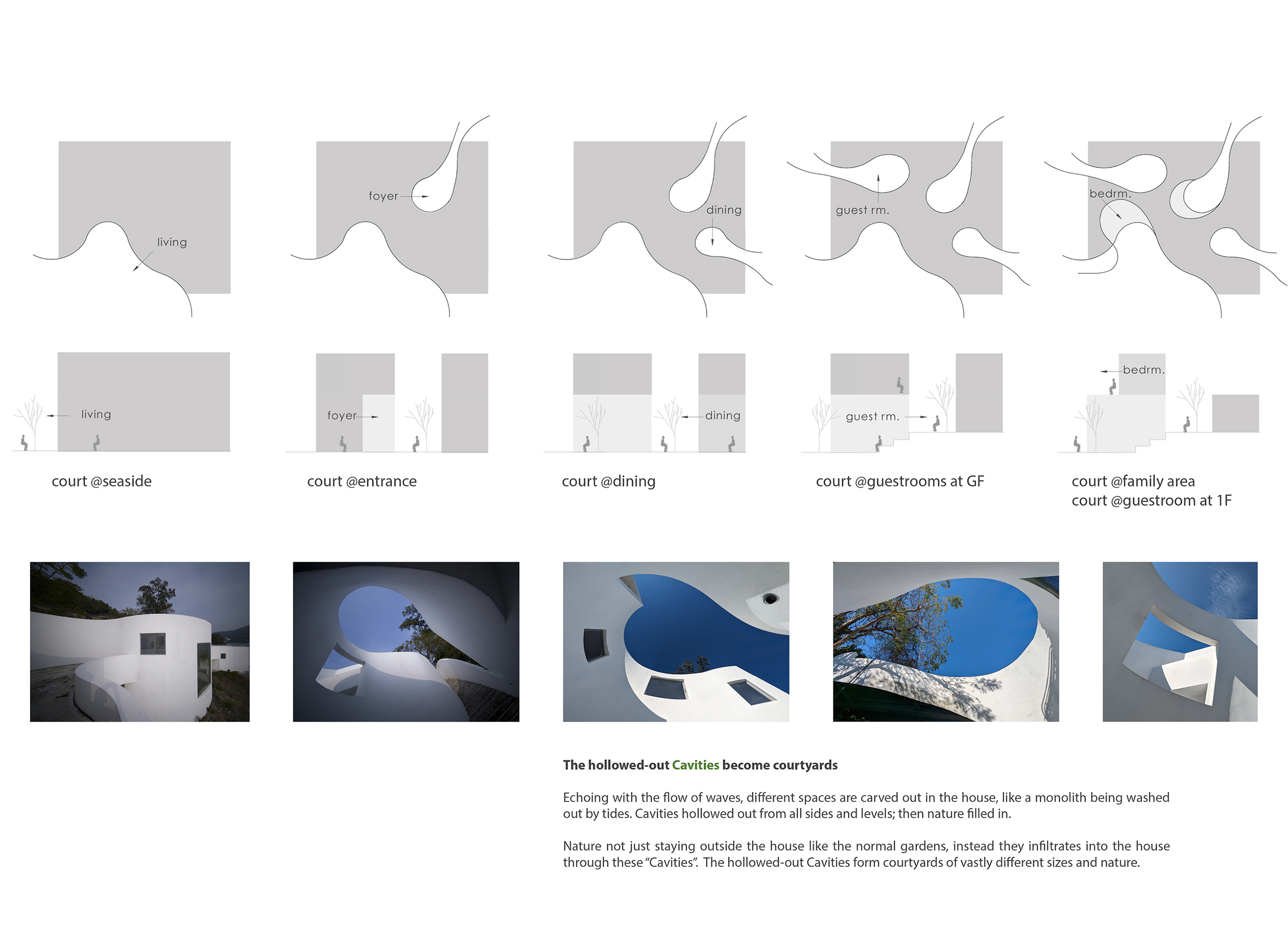 隨著海浪的流動, 屋內開闢出不同的空間,就像一塊巨石被潮水從四面八方沖刷著一樣。潮水的沖刷把這塊巨石逐步掏空,並在掏空的同時注入大自然的原素。 住在這裡就像在山洞裡漫無目的徘徊,同時亦像在洞穴中尋找新發現一樣。隨著不同的氣候、季節、甚至情緒,人們可隨心所欲的在這個幾何洞穴中尋找各自不同的路徑。 被潮水掏空的空洞,形成了一個個大小和性質截然不同的庭院,並可以從房子的各個區域進出屬於該空間的庭院。庭院與門窗的設計,一方面要適度地向大自然開放,同時亦要保持足夠的隱私度。