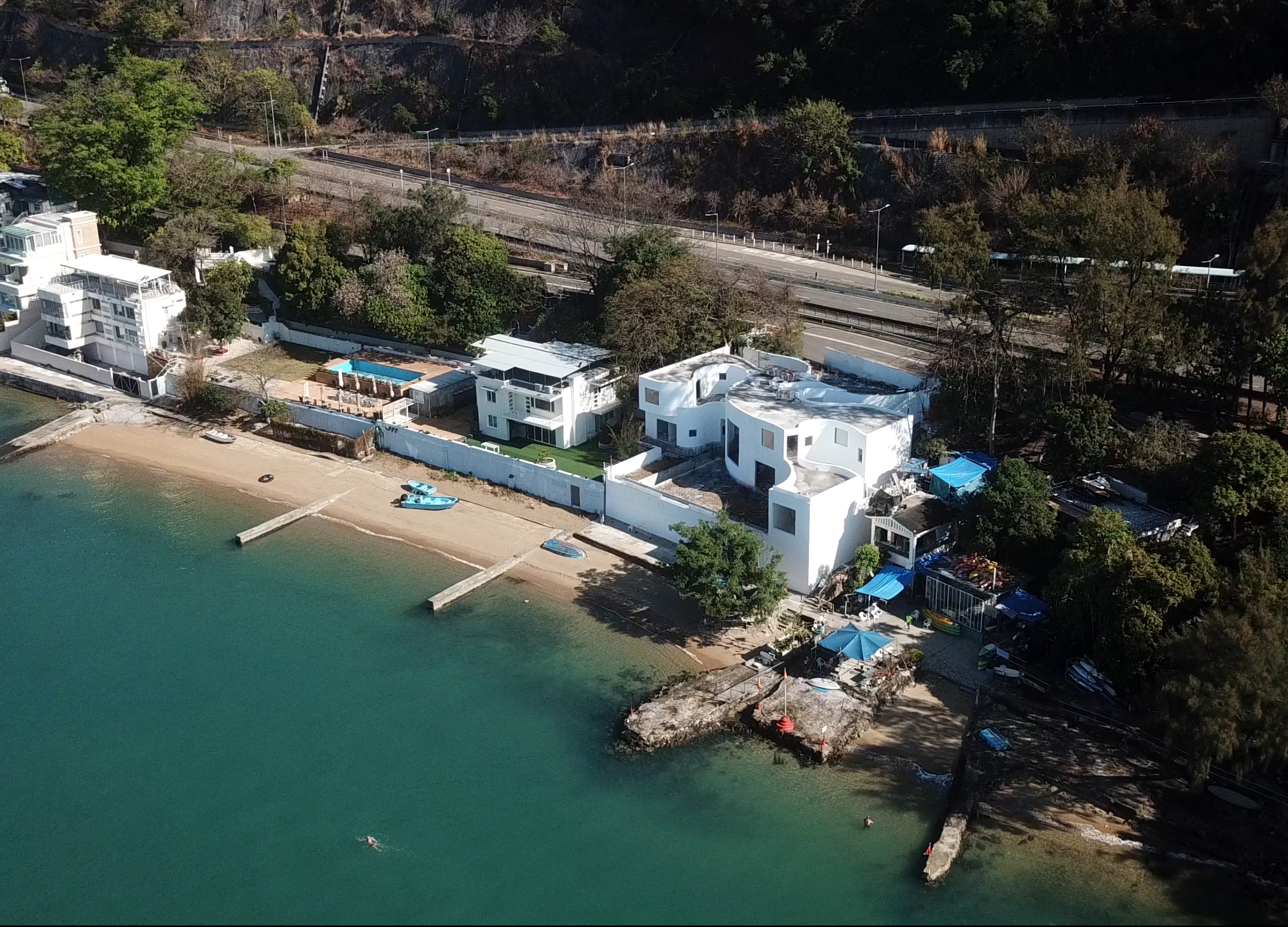 一棟兩層樓並設有停車場平台的獨立單戶住宅,坐落在山腳並面向大海。
