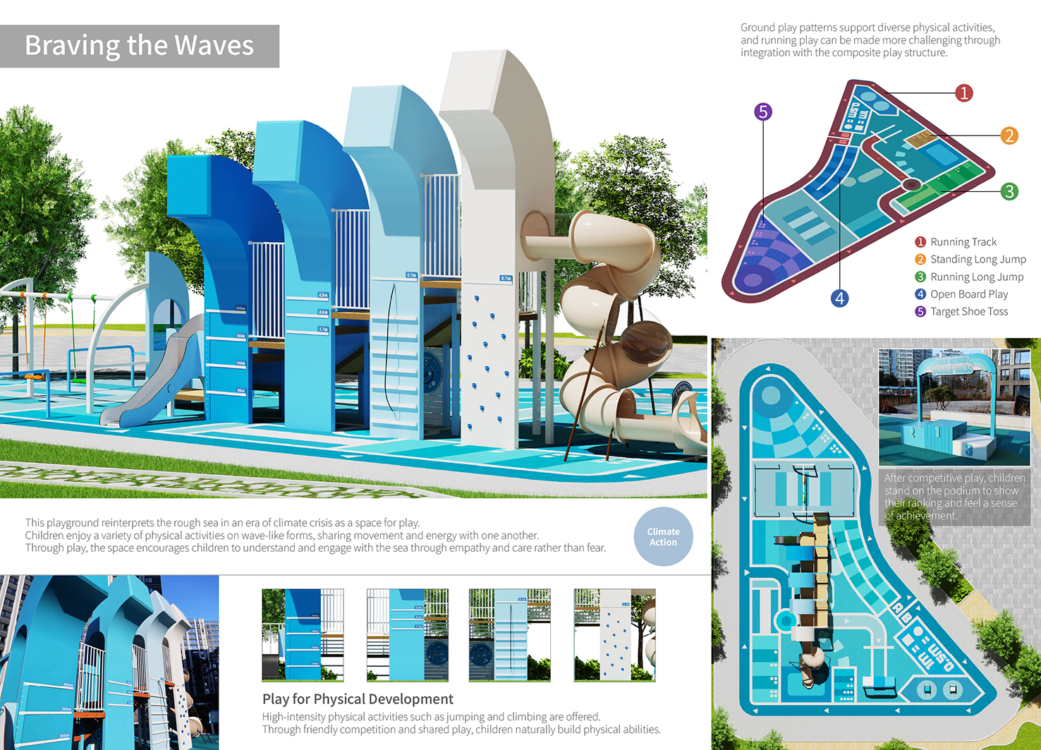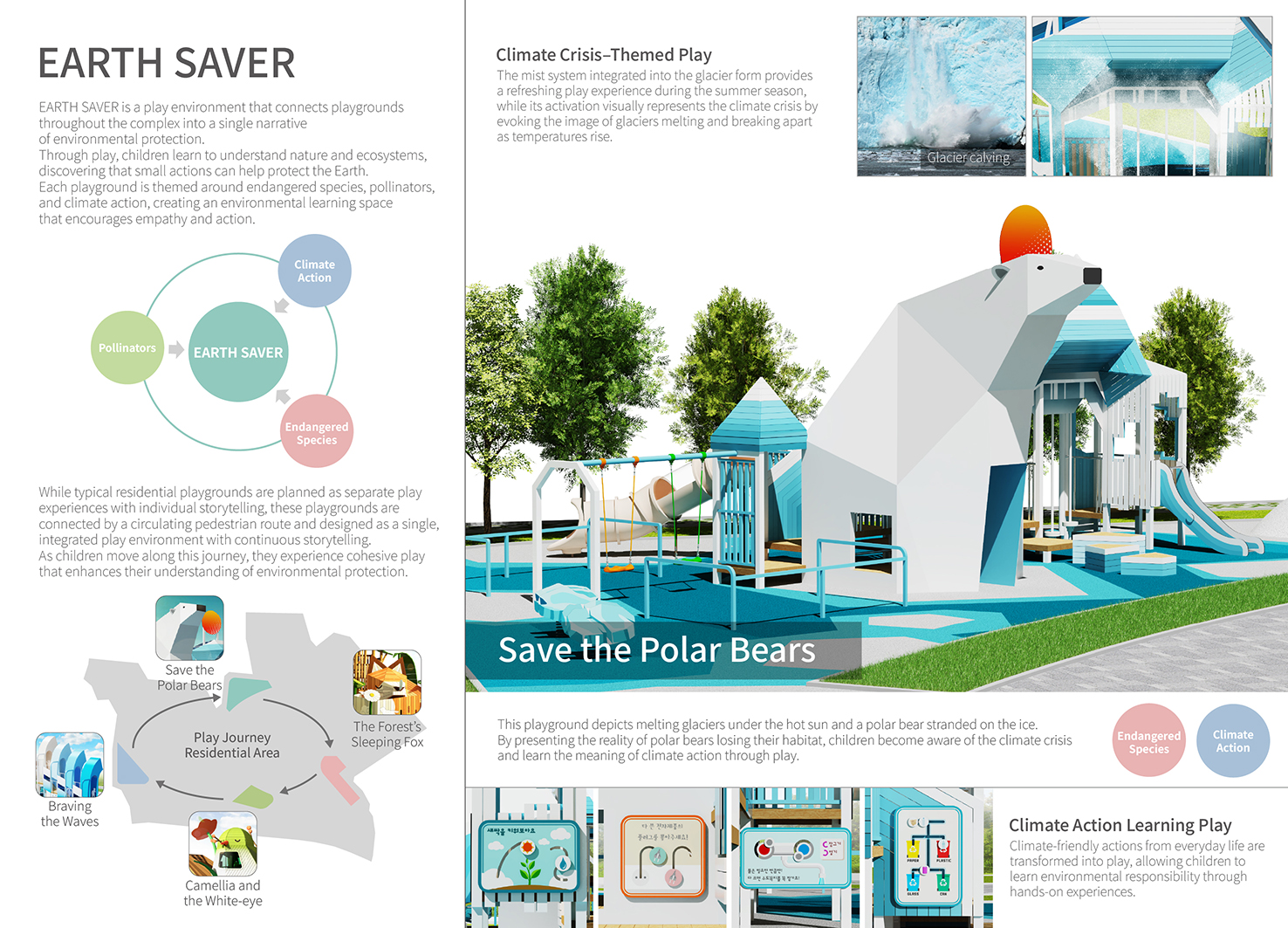 EARTH SAVER is an integrated play environment that connects playgrounds across an apartment complex into a single environmental narrative. Linked by a circulating pedestrian network, it offers children a continuous environmental play experience supported by cohesive storytelling.