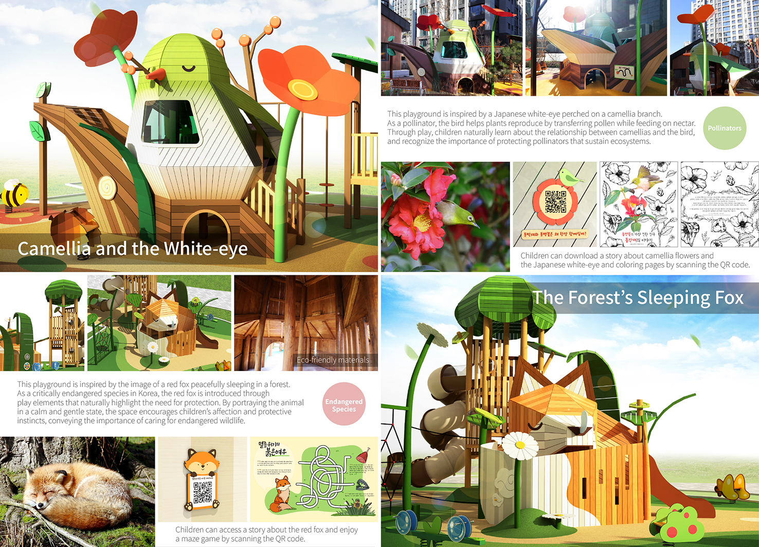 Each playground is organized around sub-themes such as endangered species, pollinators, and climate action. Through physical activity and observation, children experience the meaning of environmental protection and learn that small everyday actions can help protect the Earth, transforming the complex into a living environmental learning space for children.