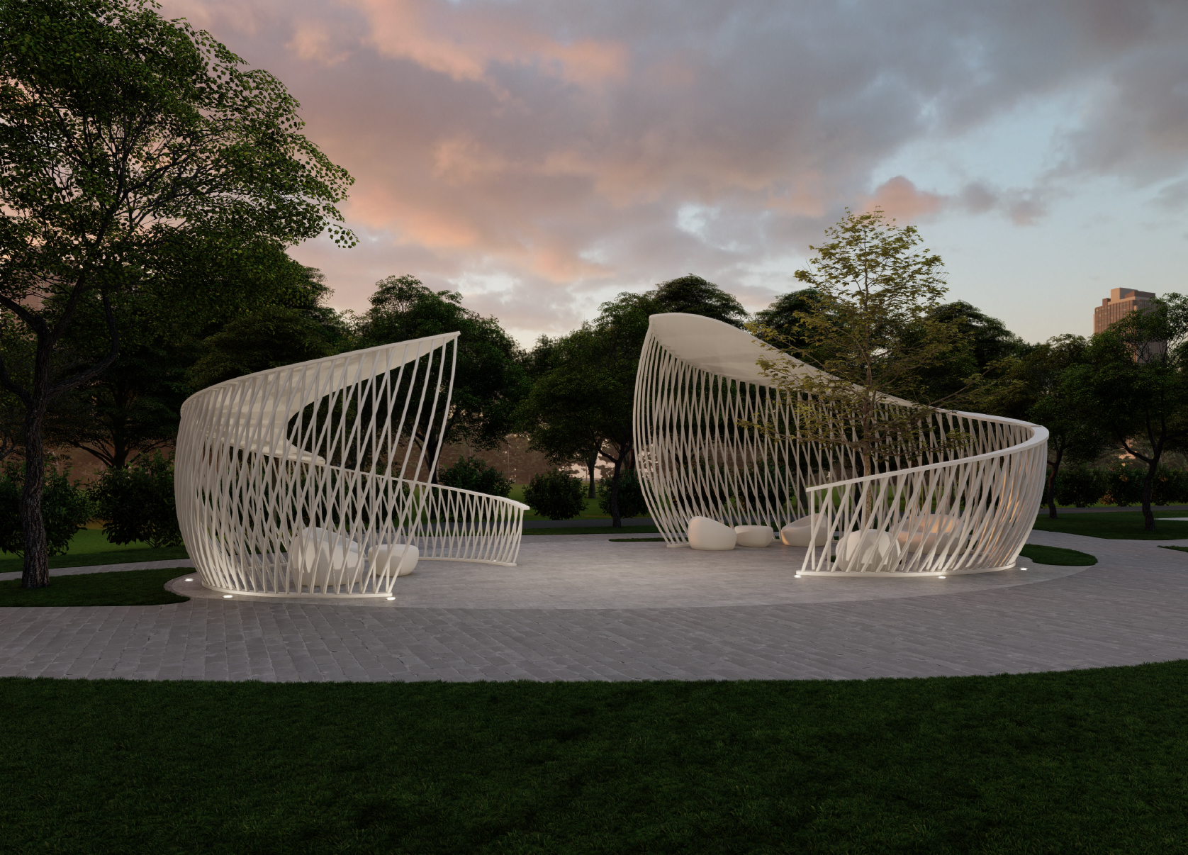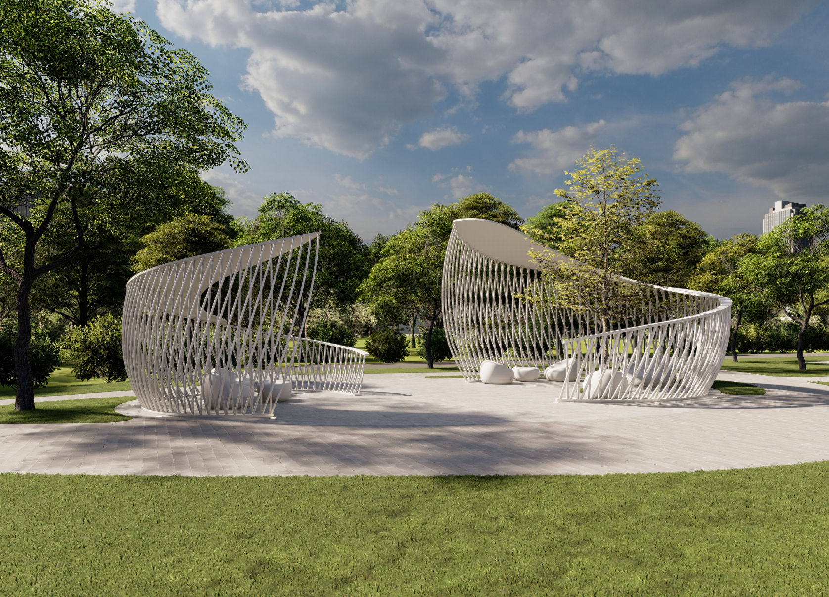 여러 곡선들을 교차하여 디자인한 조형적 외형은 단순한 구조물을 넘어 그 자체로 아늑한 감성 공간으로 기능합니다. 이는 조경 공간에 독특한 시각적 리듬감을 부여하며, ‘쉼’과 ‘머무름’이 이루어지는 장소에 예술적인 디자인 아이덴티티를 심어줍니다. 이러한 설계를 통해 본 쉘터는 조형성과 기능성이 완벽하게 조화를 이룬 따뜻한 휴식의 공간으로 완성되었습니다.