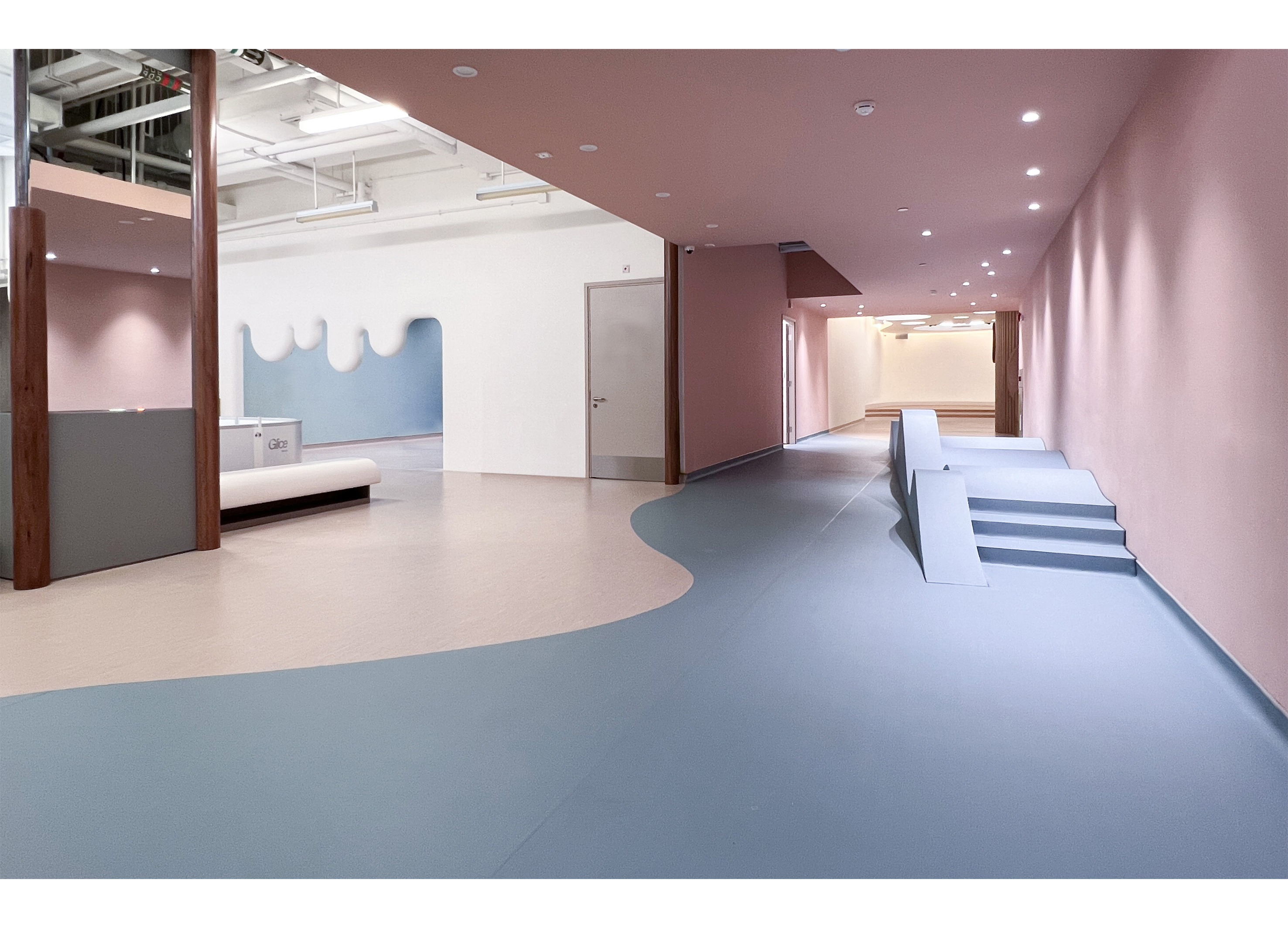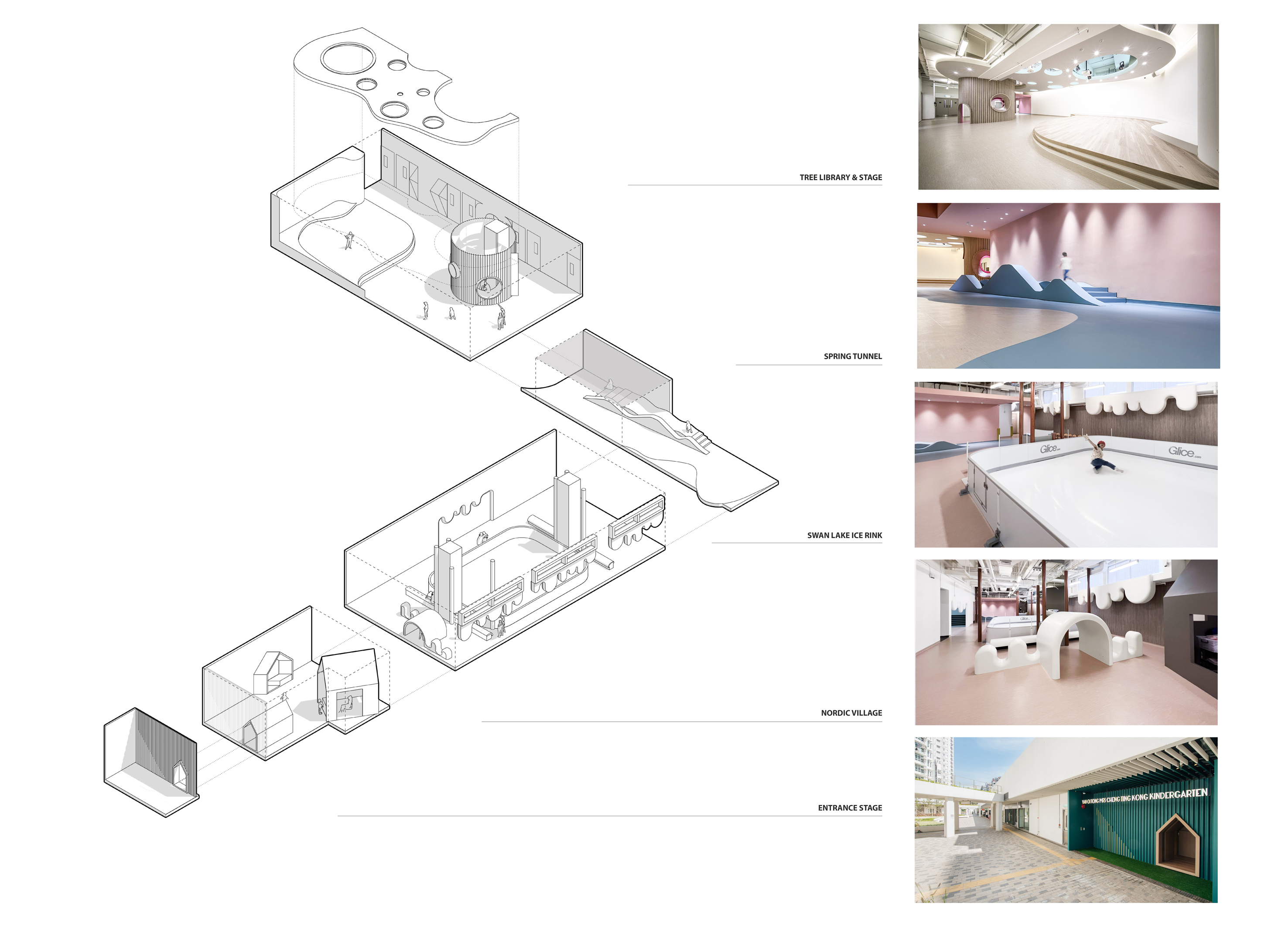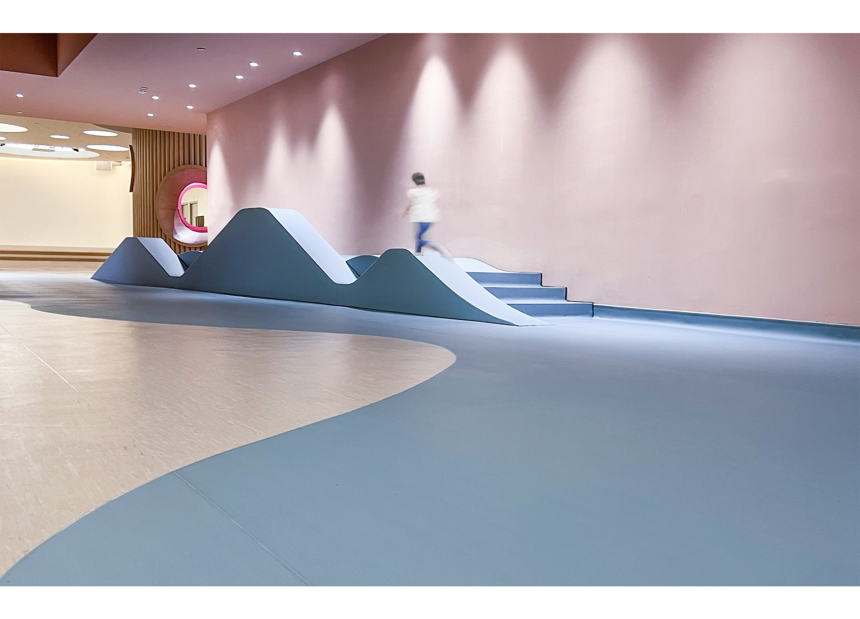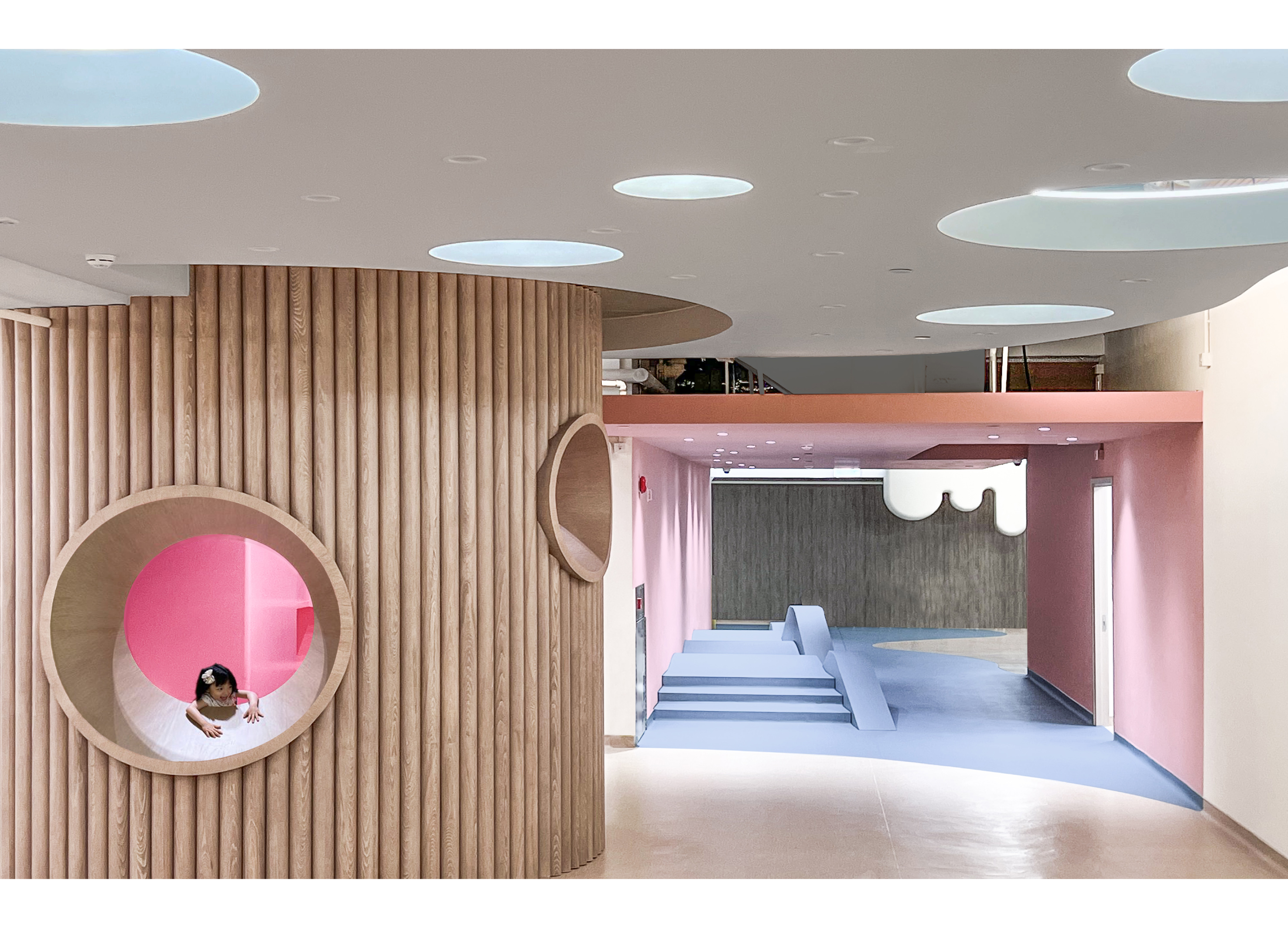 The school is made up of 4 Drama Scenes. The Entrance Scene is a stage where kids can enter via a tiny door. Thick columns transform into slender tree trunks in forest in Winter Scene and expand as a tree library in Summer Scene. Between the 2 Scenes is a Spring Scene with a transitional pink tunnel. Scale changes along Scenes, enriching kids’ experience.