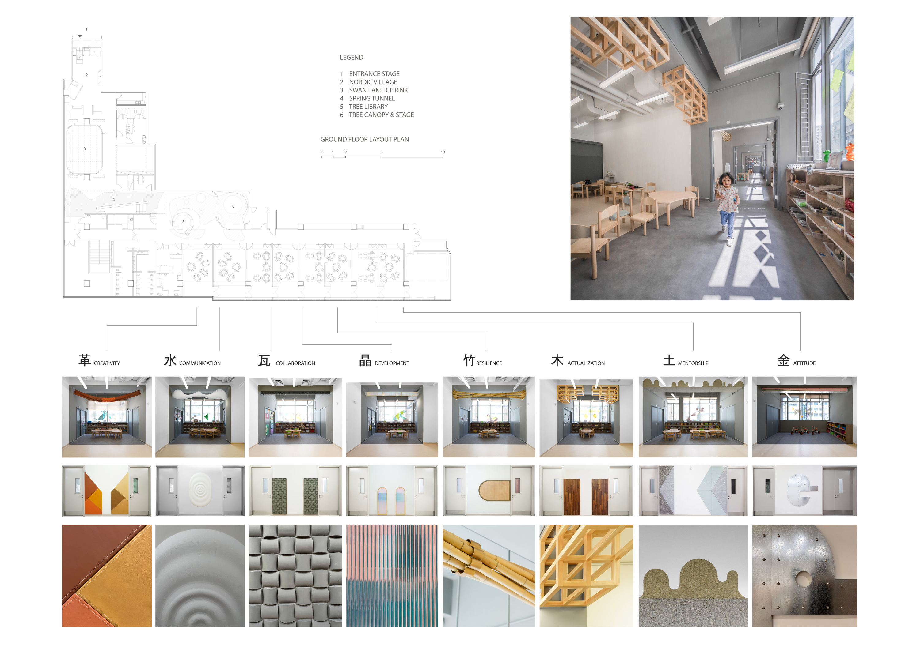 原有的教室是單調的四方型盒子。為增添教室風格,設計為每個教室各自配置了不同的材質。通過木頭、竹子、金屬等材質,孩子很容易認出自己的教室,建立歸屬感。孩子們還可以透過觀看材質、觸摸它們或敲擊它們,刺激不同的感官。材質的屬性對應著不同的生命美德,鼓勵孩子追求這些品質。