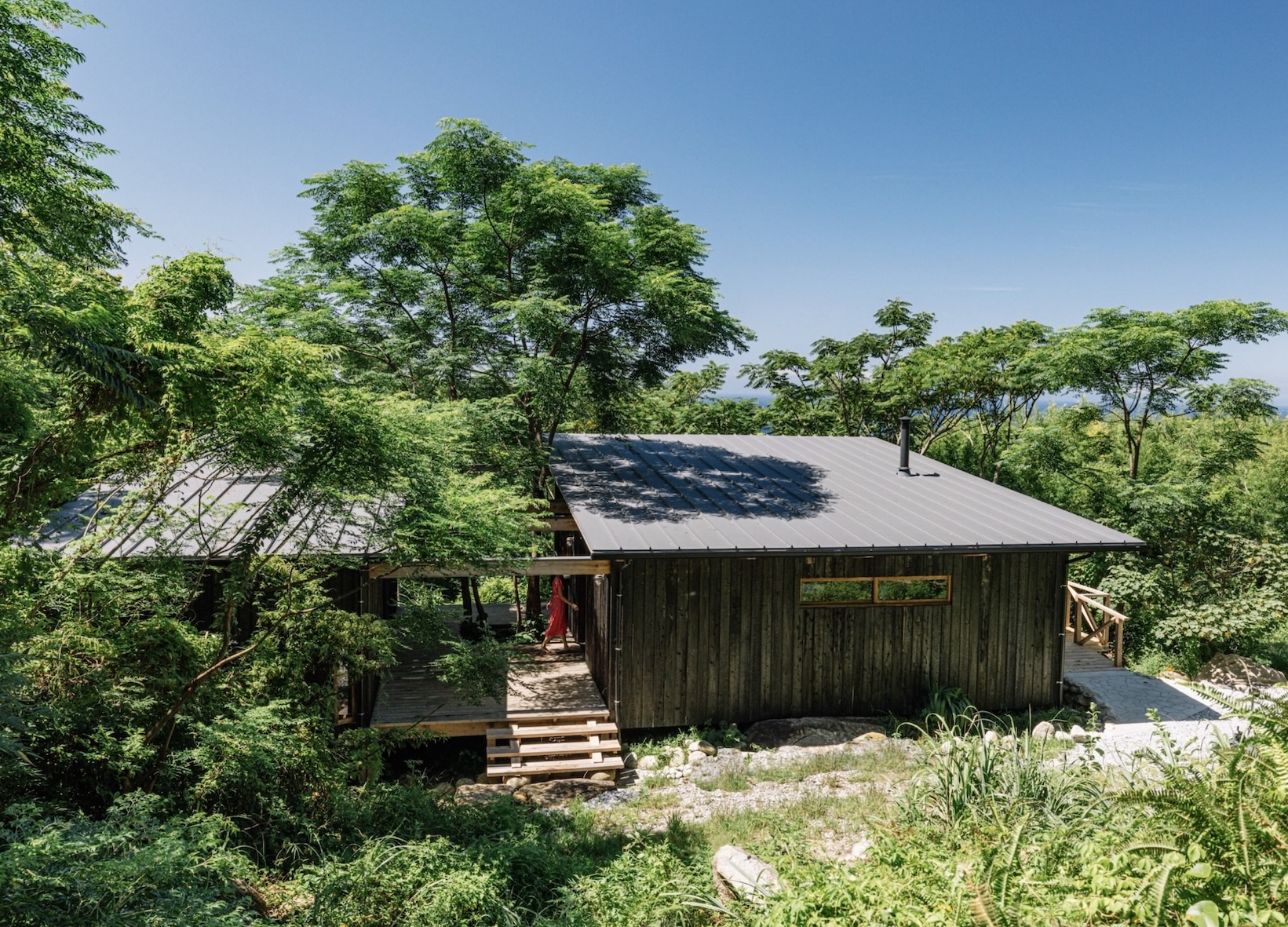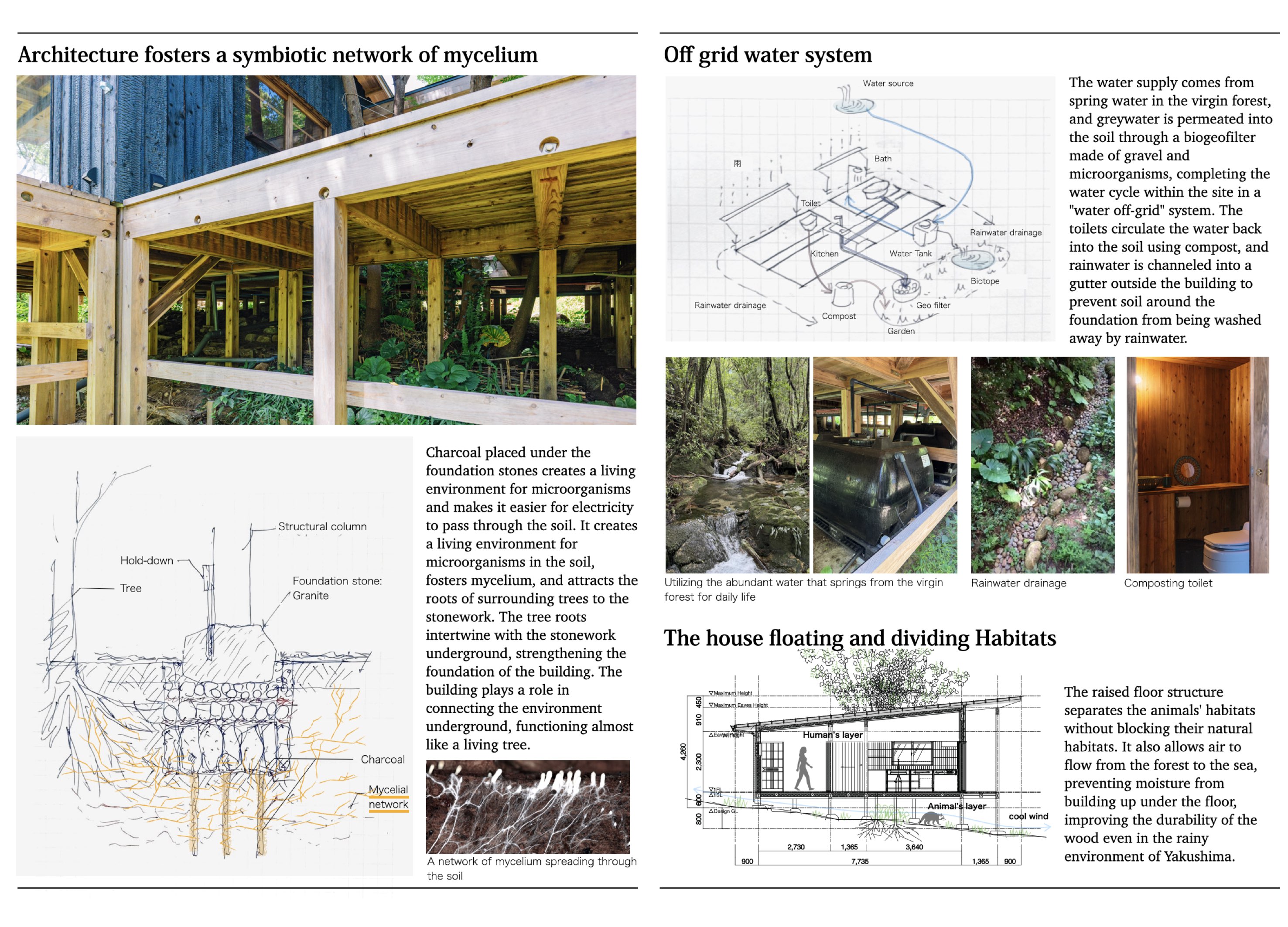 この建築は、既存の植生や岩、湧水などの自然環境を活かすように配置されており、自然と密接に暮らすだけでなく、土中の微生物を活性化し、自然の循環そのものを再生・豊かにすることを目的としたリジェネラティブハウスです。