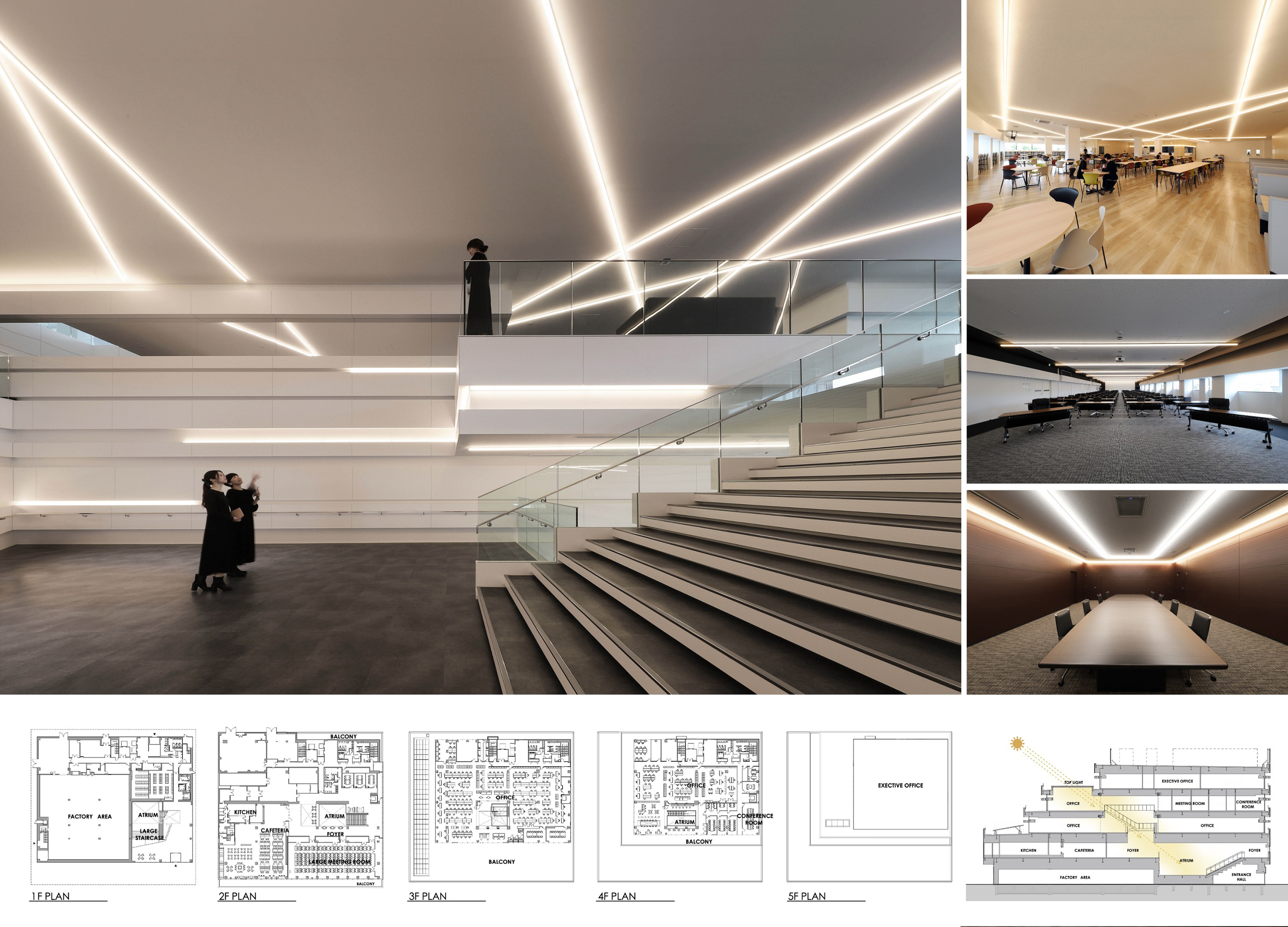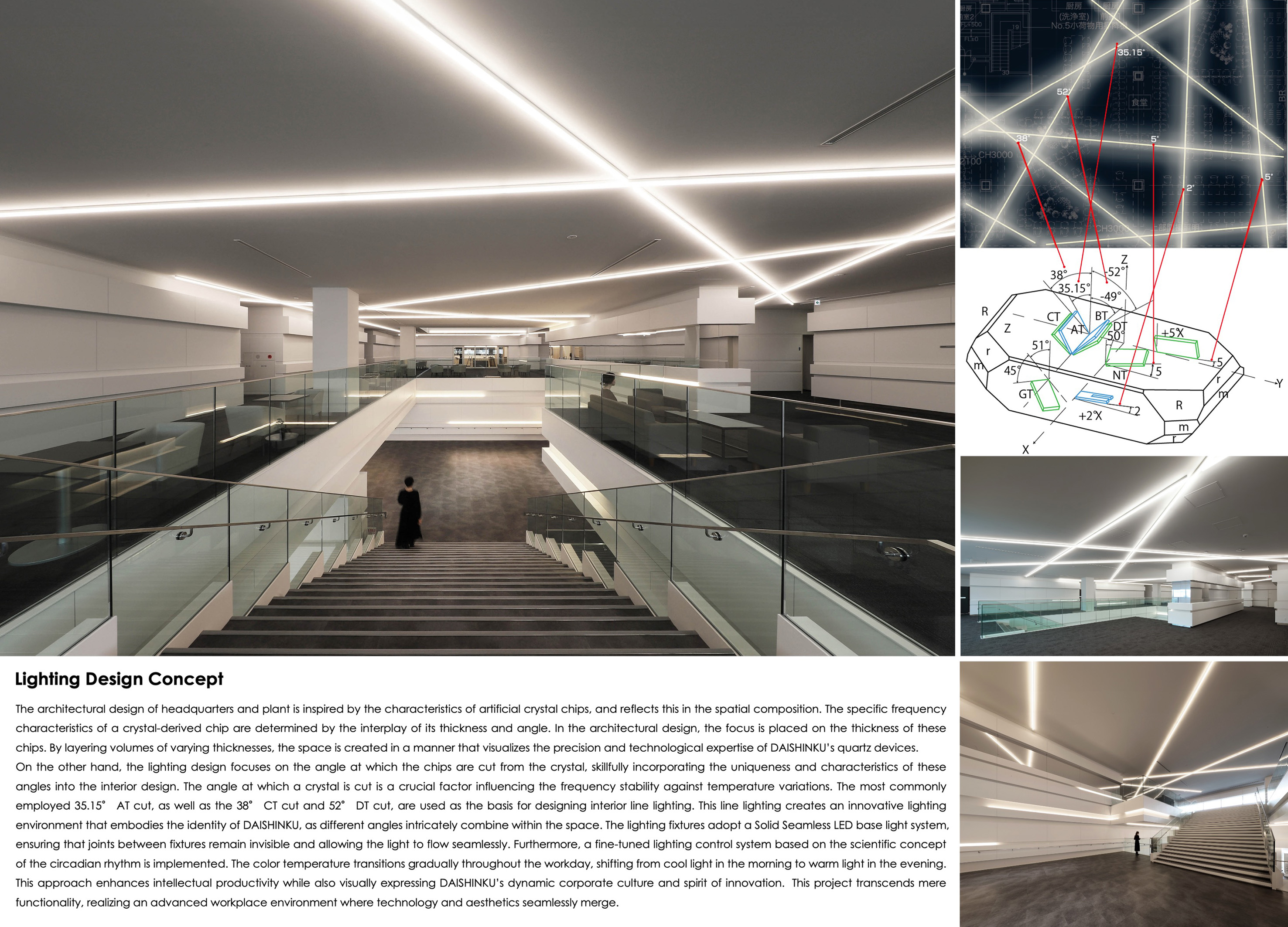 大真空は「水晶デバイス」の製造販売を行う日本のリーディングカンパニーである。本プロジェクトは既設の中央研究所に隣接した敷地に、本社機能と工場機能を統合したスマートファクトリーを実現するものである。建築の外観「積層する水晶チップ」をデザインモチーフとし、大小異なる矩形状の5層のボリュームを積層することで、同社の技術の積み重ねと未来への発展を象徴している。水晶から取り出されるチップは、その厚みと角度の組み合わせにより周波数特性が決定される。建築デザインではこの「厚み」に着目し、異なる厚みのボリュームを積層して空間を構成している。このモチーフは外観だけでなく内部空間にも展開され、企業アイデンティティを可視化している。各フロアは中央部の吹抜空間を中心に構成され、トップライトからの自然光が各層に広がる設計としている。これにより省エネルギー性能と開放性を高めるだけでなく、上下階のワーカーの出会いやコミュニケーションを促進している。インテリア照明は、水晶チップを切断する際の「角度」に着目してデザインされている。チップの厚みは共振周波数を決定する主要素であり、角度はその安定性に影響を与える。最も採用される35.15°のATカット、38°のCTカット、52°のDTカット等、それぞれの角度を基に設計されたライン照明が、空間内で複雑に組み合わされることで、大真空のアイデンティティを体現する光環境を創出している。またサーカディアンリズムに基づいた色温度の変化を取り入れ、知的生産性の向上にも寄与している。