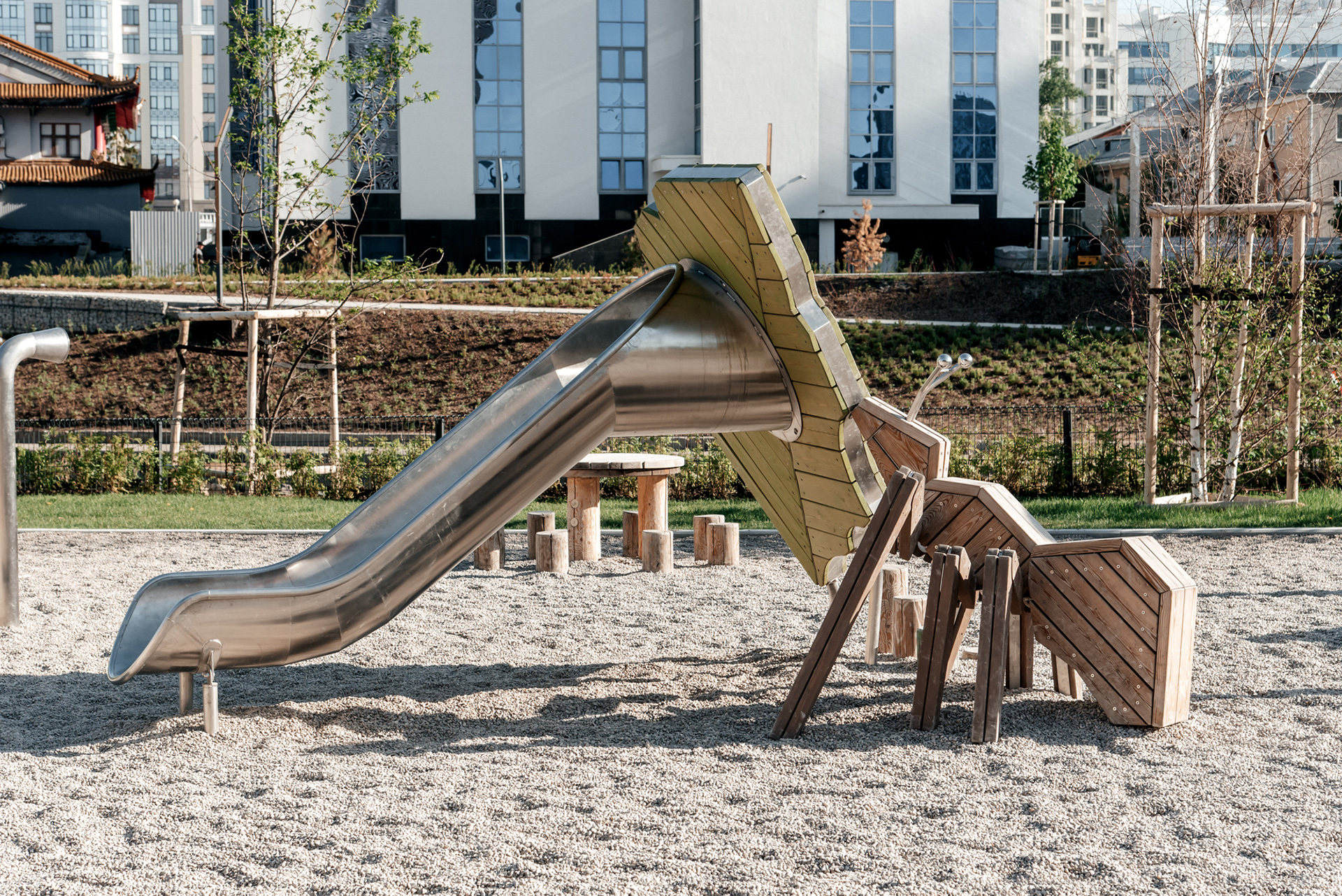 The series consists of large Trees complexes, Mushrooms and Bears playhouses, and small Ants and Leaves structures. Trees are fitted with interior climbing structures, lattice intersections, and a selection of open and closed slides at various heights for older children looking for active play to learn risk management in safe conditions. Mushrooms host light activity and roleplay, and Bears allow to communicate trough speaking pipes located inside. Ants and Leaves provide safe conditions to train balance, agility, coordination and strength to the younger children.