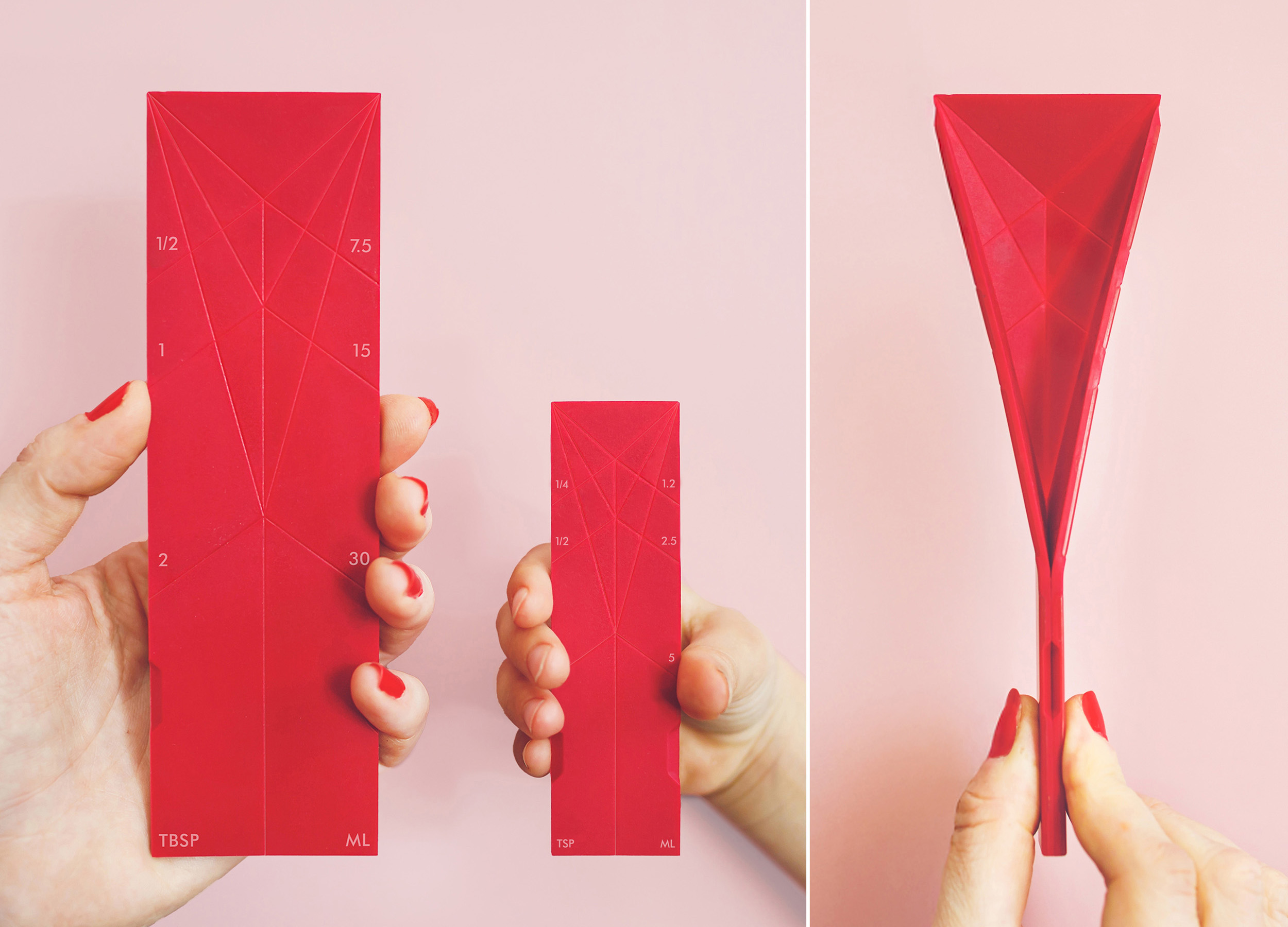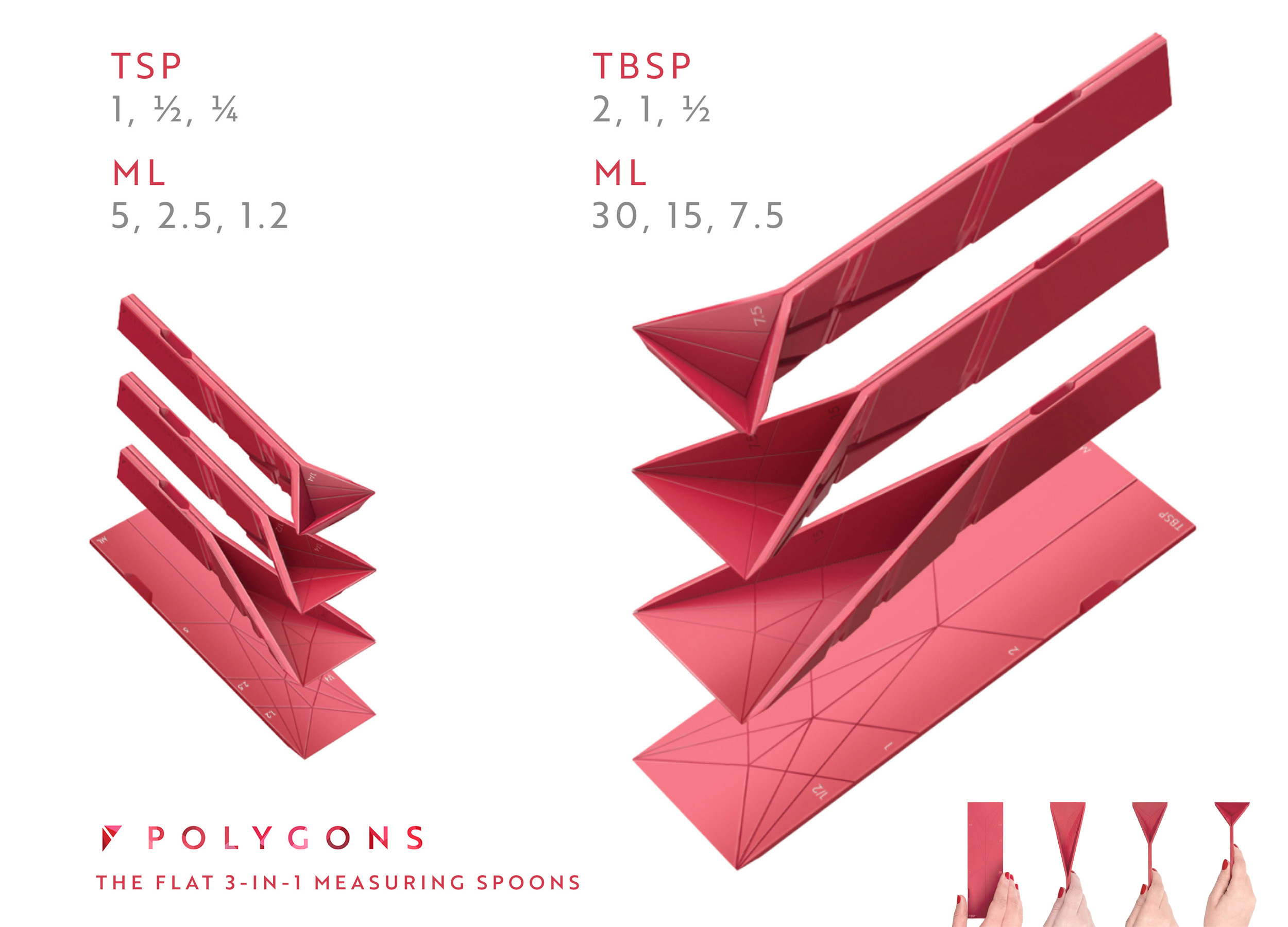After 3000 years, the humble spoon has been reinvented. Polygons flattens an entire measuring spoon set into an origami sheet just 0.1 inch thin.