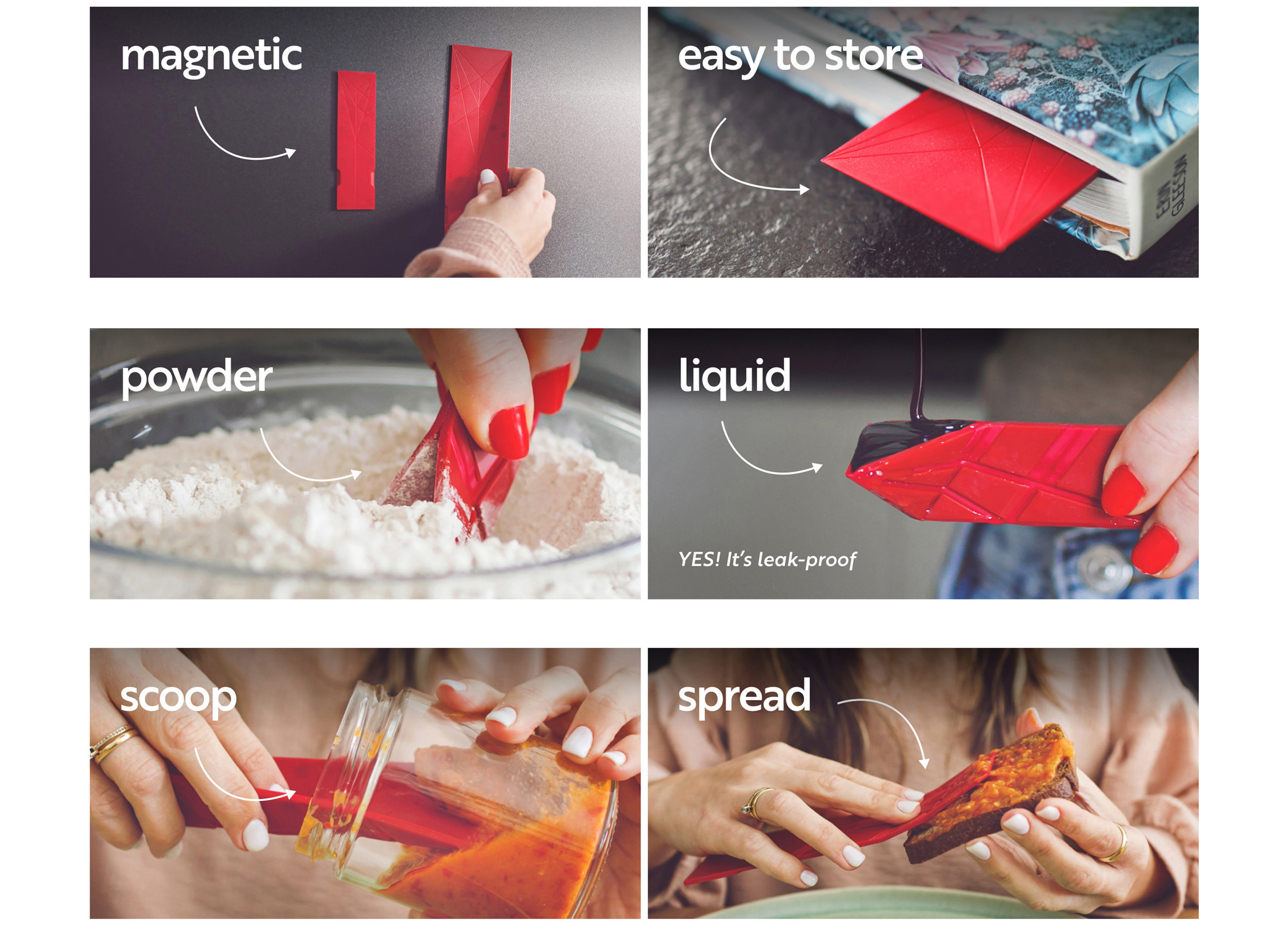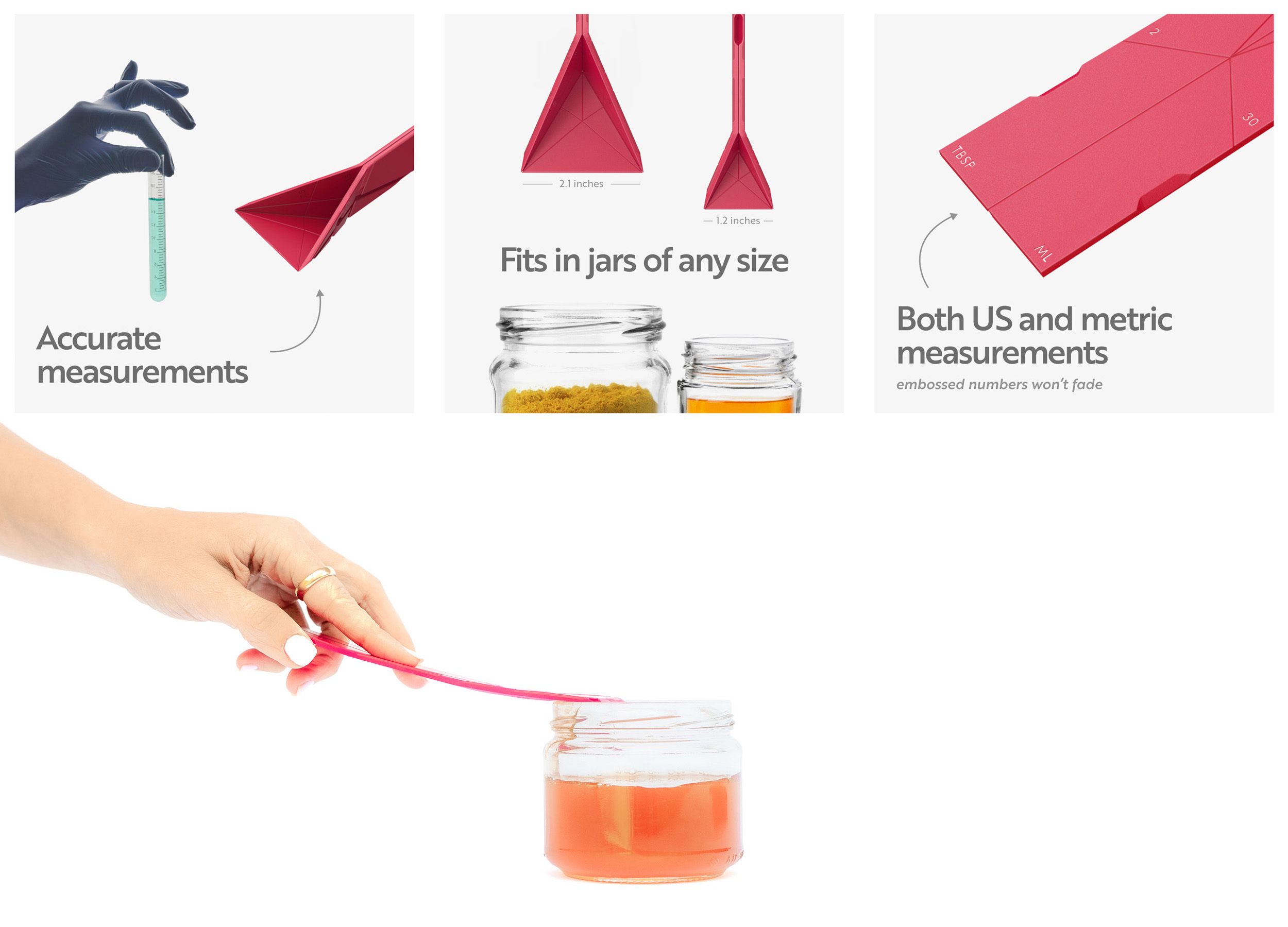 Pinch it to form the 3 volumes cooks use most (½ Tbsp, 1 Tbsp, 2 Tbsp on the big spoon - and ¼ Tsp, ½ Tsp, 1 Tsp on the small spoon), flatten to wipe clean, and stick magnetically on your fridge.