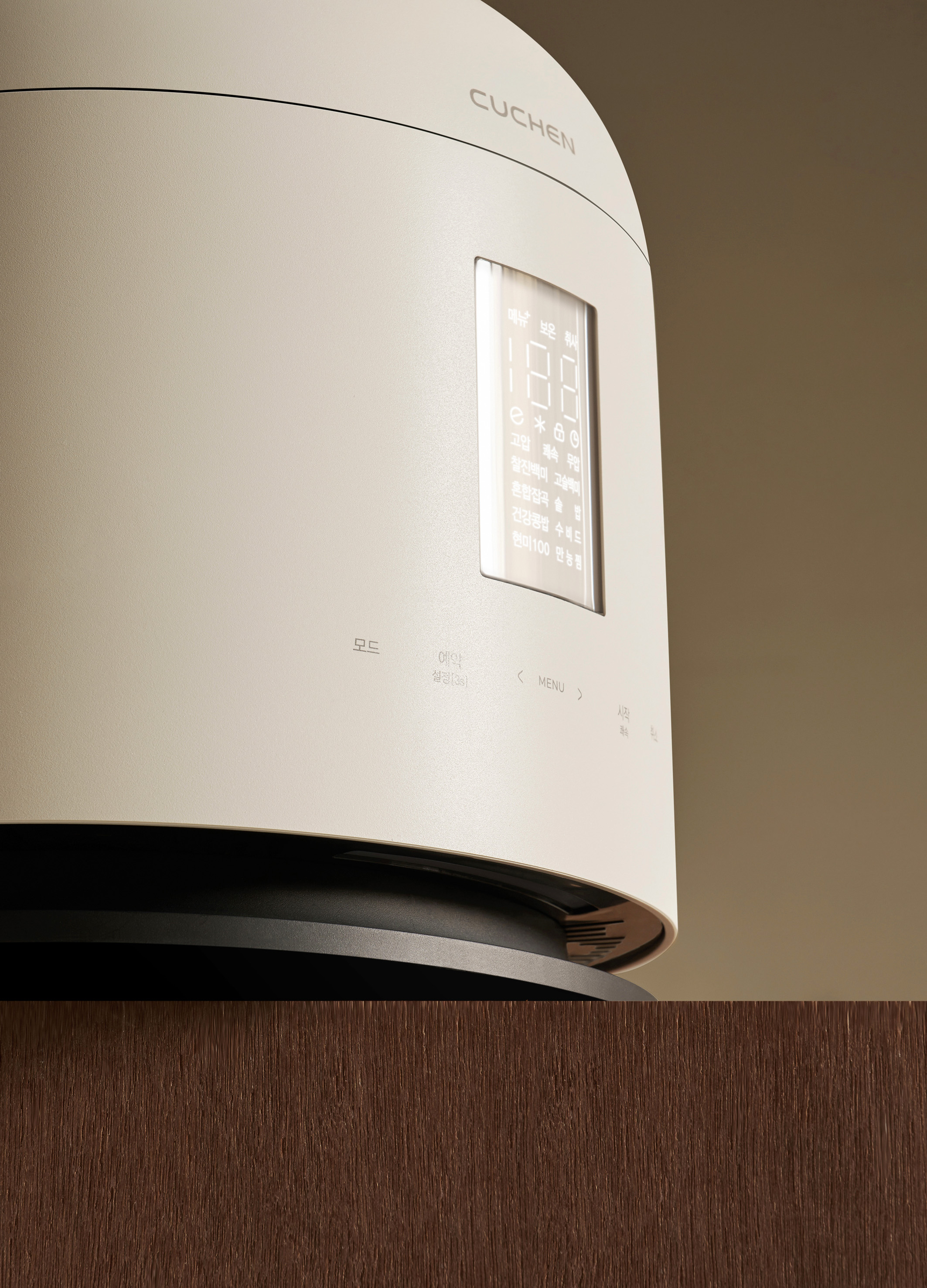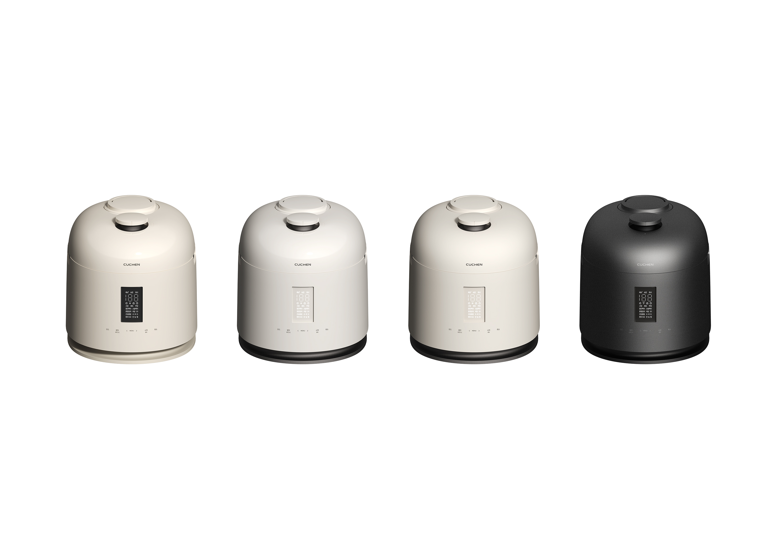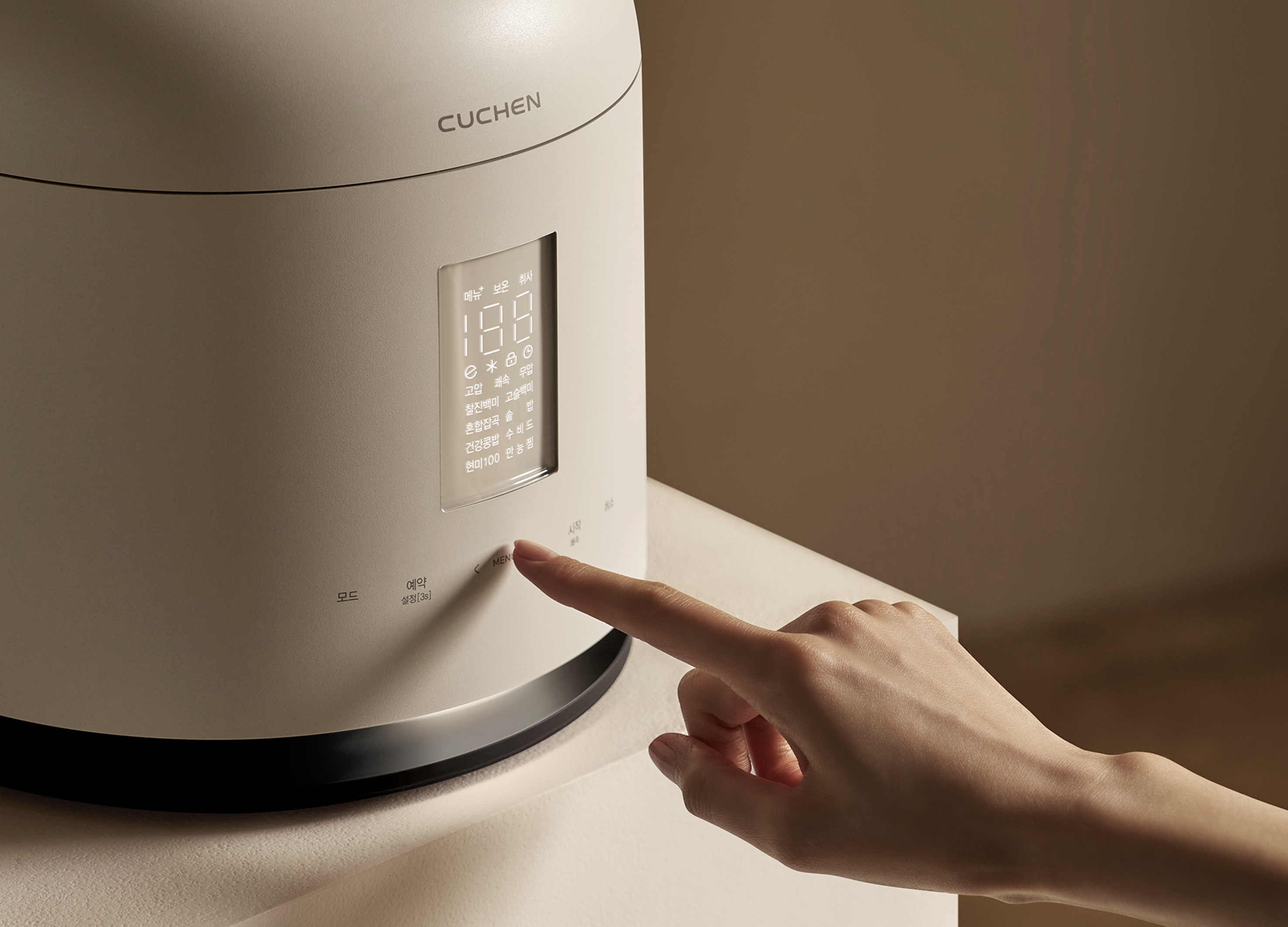 ‘CUCHEN 123’은 고도화된 취사 성능과 공간 경험의 가치를 확장한 프리미엄 라인의 IH압력 밥솥입니다. 이 제품은 밥솥 본연의 기능을 넘어, 사용하지 않을 때에도 갤러리 감성의 오브제이자 무드 라이팅으로서 공간에 자연스럽게 어우러지는 ‘공간 내 다용성’의 가치를 제공합니다. 국내외 경쟁 제품 대비 '2.2기압·123℃ 신기술'을 적용해, 곡물의 크기와 경도에 관계없이 빠르고 부드러운 최적의 취사가 가능합니다. 섬세한 열 알고리즘 연구를 통해 구현한 13가지 잡곡 메뉴 옵션은 사용자의 조리 고민을 덜어주는 간편한 취사 경험을 제공하며, IoT 기능을 통해 앱에서 취사 패턴을 분석하여 건강 관리까지 지원합니다. 제품 하단부의 히든 라이팅은 동작 및 안전 상태를 직관적으로 전달하고, 미사용 시에는 은은한 무드 라이팅으로 공간에 감성적인 분위기를 더합니다. 유광 또는 무광의 투-트랙 모델 전략은 홈 인테리어에 따른 선택의 유연성을 제공하며, 저채도의 차분한 CMF와 미니멀한 돔 실루엣은 주방을 넘어 공간 속 하나의 오브제로 자연스럽게 전환됩니다.