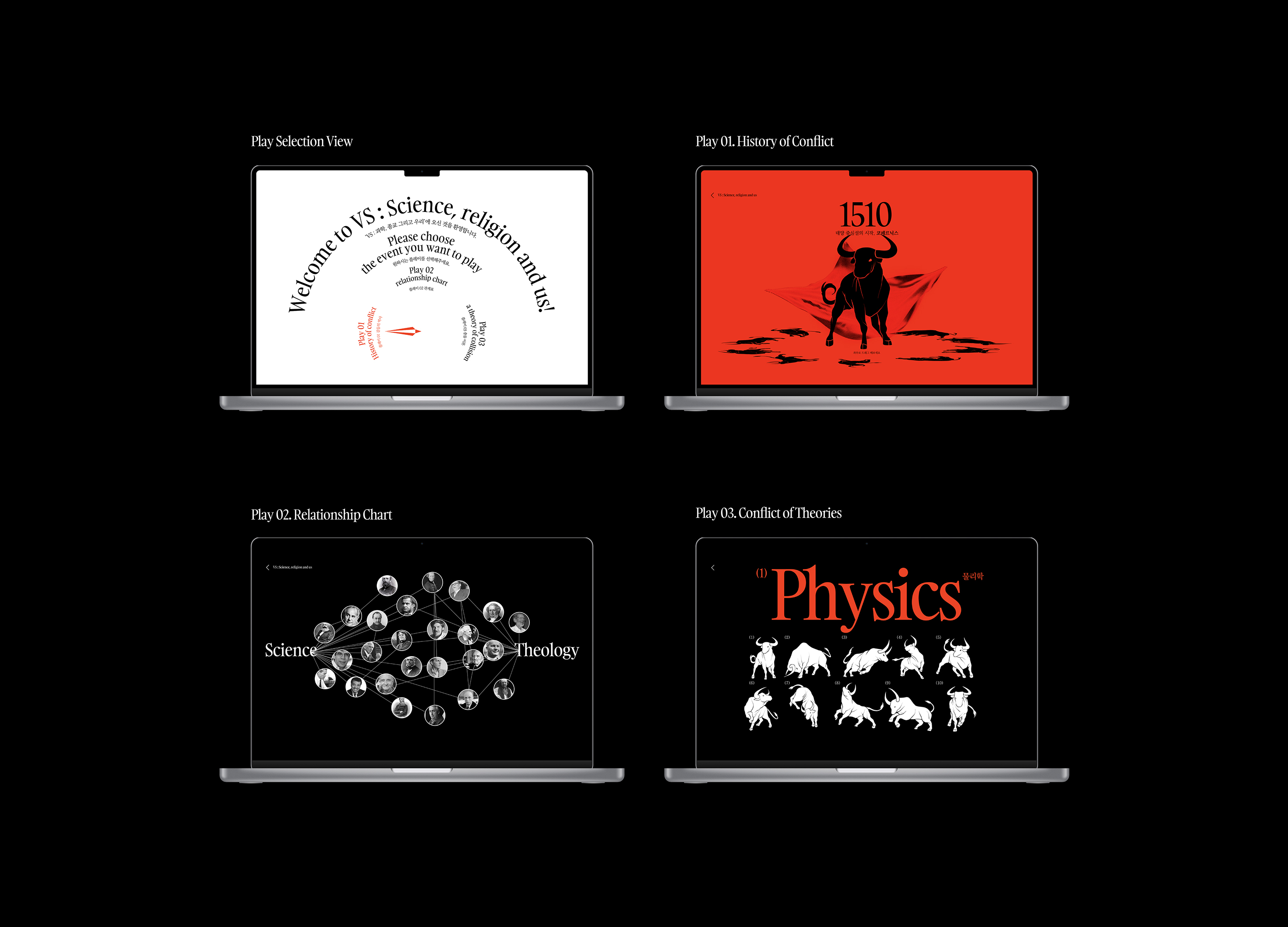 'VS: Science, Religion, and Us'는 대표적인 갈등 사례인 과학과 종교의 역사적 관계를 통해, 우리 사회에 축적된 갈등의 심각성과 그 사회적 위험성을 조명합니다. 현대 사회는 다양한 이해관계와 가치관이 교차하며 여러 형태의 갈등이 나타나고 있습니다. 특히 한국 사회는 갈등이 일상화된 환경에 놓여 있으며, 이 작업은 이러한 상황을 과학과 종교의 관계라는 역사적 맥락을 통해 다시 살펴보고자 합니다. 프로젝트의 핵심인 과학과 종교의 상호작용은 투우의 이미지를 통해 시각화됩니다. 과학은 투우장의 소로 표현되며, 소의 크기와 동작 변화는 사회적 인식과 질서에 변화를 가져온 과학의 힘을 상징합니다. 종교는 투우사로 등장하며, 투우사가 사용하는 천의 크기와 흐름은 변화에 대응하는 종교의 다양한 태도와 반응을 나타냅니다. 본 작업은 갈등의 단면뿐만 아니라, 상호 이해와 조정을 통해 공존해 온 역사도 함께 다룹니다. 이를 통해 사회 속의 갈등을 단순한 대립이 아닌 '관계와 조율의 과정'으로 바라보며, 우리 시대에 필요한 공존의 가능성을 사유할 수 있는 계기를 마련하고자 합니다.