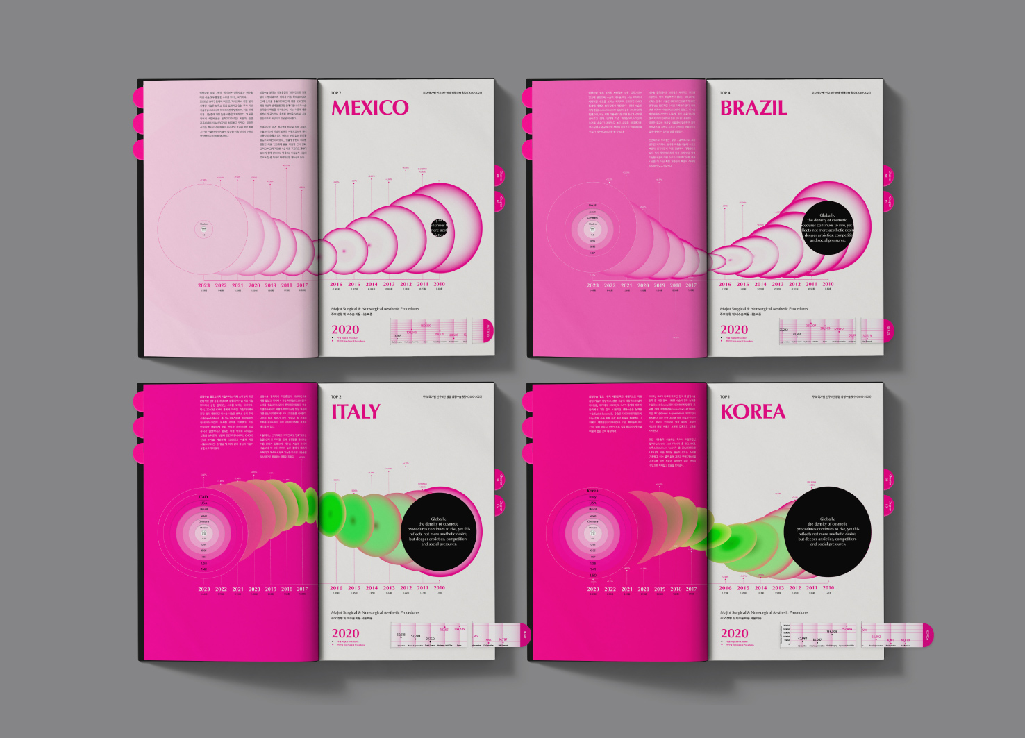 MIMIC GIMMICK visualizes the global trend of imitation-driven cosmetic surgery through the metaphor of the mimic octopus. Just as the octopus imitates other sea creatures to survive, people in appearance-obsessed societies undergo surgery to replicate others’ looks. Using data from eight countries, the project reinterprets statistics into tentacle-inspired graphics within an interactive pop-up book. Die-cut pages and sliding charts invite viewers to physically engage with the data, raising awareness about the loss of identity through imitative surgery and encouraging appreciation for authentic, individual beauty.