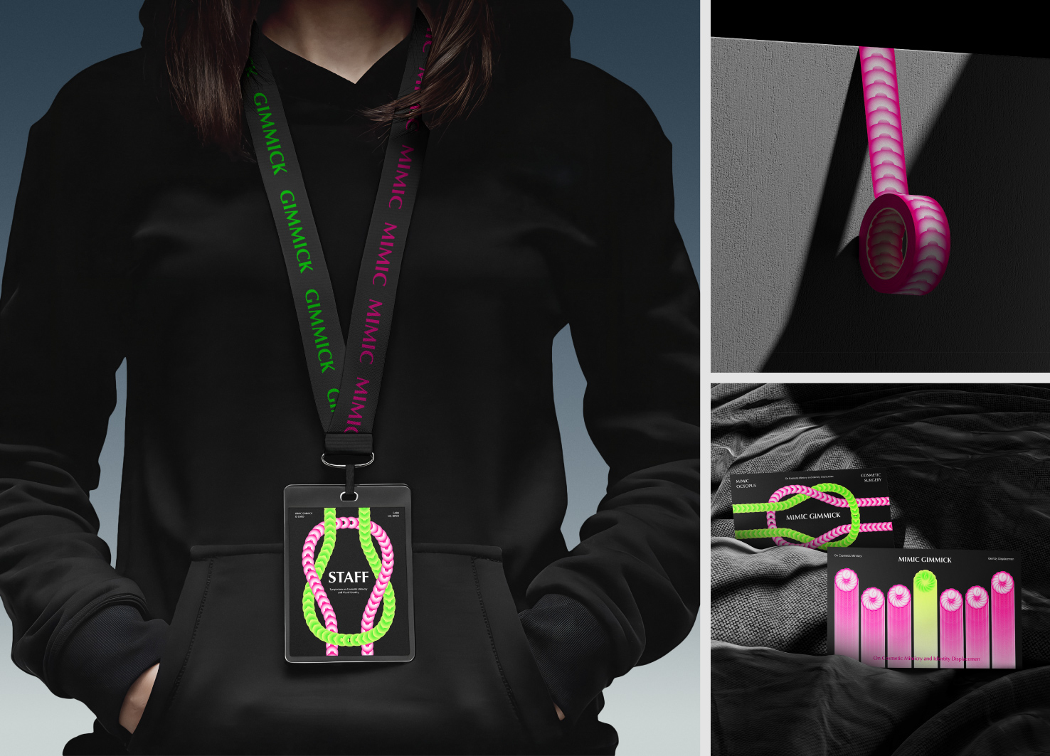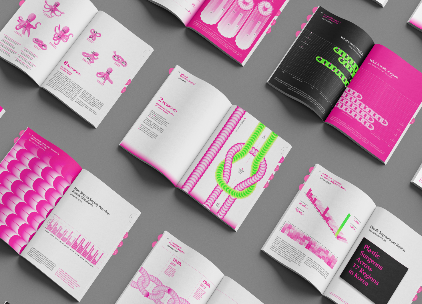 MIMIC GIMMICK은 글로벌 미용성형 담론에서 나타나는 무분별한 모방 현상을 ’흉내문어(Mimic Octopus)’라는 메타포로 시각화한 프로젝트이다. 흉내문어가 생존을 위해 다른 해양생물을 완벽하게 모방하듯, 외모지상주의 사회 속 사람들은 타인의 외모를 따라하는 성형을 선택한다. 8개국의 성형수술 데이터를 수집해 흉내문어의 다리를 연상시키는 그래픽 형태로 재해석했다. 팝업 북 구조로 문어의 입체감과 볼륨감을 표현했으며, 컷팅된 페이지 사이로 삽입된 슬라이드 형식의 그래프는 문어 다리를 잡아당기는 듯한 물리적 경험을 제공하고자 했다. 각 페이지 커팅을 통해 구조적 깊이와 표면 질감을 구현하고, ‘흉내’라는 주제의 반복성과 중첩성을 시각적으로 드러냈다. 본 프로젝트를 통해 자신의 정체성을 지우는 모방 성형 문화에 대한 경각심을 가지고, 각자의 고유한 아름다움을 발견하고 존중하는 문화가 형성되기를 바란다.