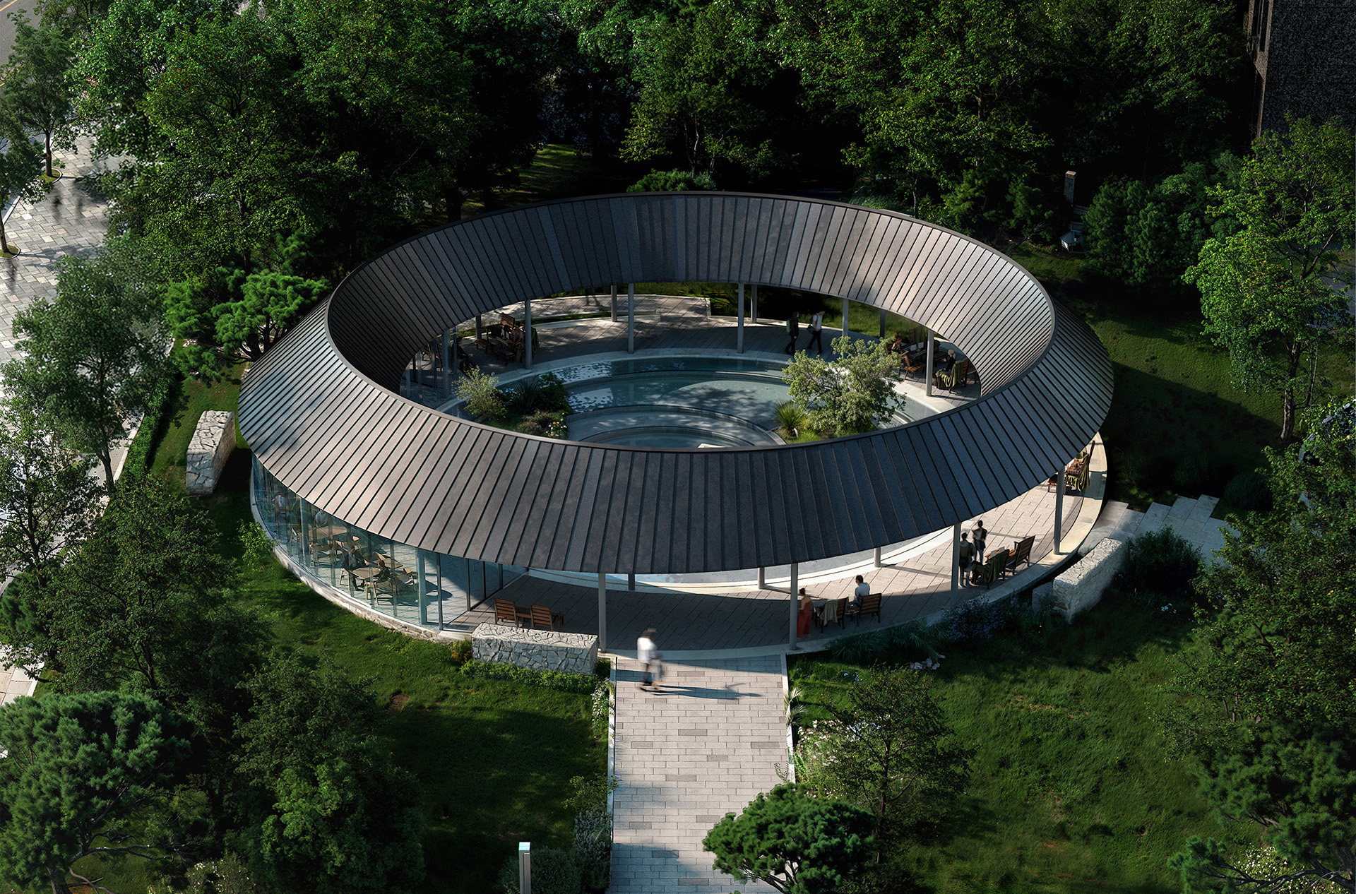 The central design concept of Park Oasis is The Circle of Connection, which we realized through three key ideas: circulation, center, and connection. First, circulation is expressed through the organic circular plan, which naturally guides visitors’ movement and sightlines inward, creating a continuous flow without a defined beginning or end. Rather than prescribing a fixed path, the intention was to allow moments of staying and moving to seamlessly unfold as part of a unified experience. Second, the concept of center is embodied in the quiet water feature placed at the heart of the architecture. This central space offers a contemplative environment where visitors can pause and reflect, functioning not only as a visual focal point but also as an emotional anchor that stabilizes the rhythm of the entire space. Finally, connection is articulated through the circular structure itself, which dissolves the boundaries between people, nature, and the city. The space is designed to remain open both inward and outward, enabling a continuous dialogue rather than separation. The choice of a circular form was driven by its ability to most intuitively express this idea of connection, creating an environment where elements relate to one another on equal terms without hierarchy, and where spatial relationships are defined through continuity rather than division.